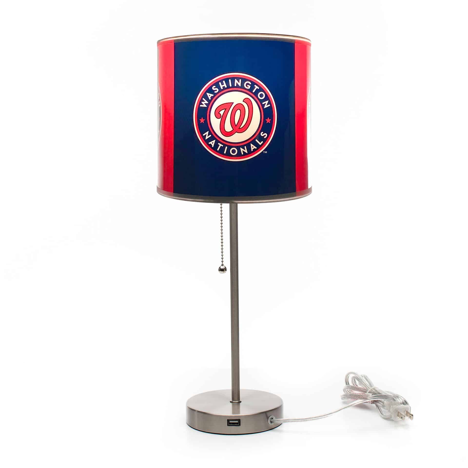 Show off your team pride with this Washington Nationals USB Charging Chrome Lamp! This sleek lamp is perfect for adding a touch of fandom to your man cave, home office, or any room that needs a little extra light. It features a stylish chrome design that fits seamlessly into any space. The USB charging station lets you charge your devices. The unique patented lamp shade program allows you to easily change the look of your room by purchasing new shade inserts. The lampshade insert is printed with a high-resolution team design and is licensed by MLB. This lamp has dimensions (LxWxH): 8 x 8 x 19, a product weight (lbs): 3, and is made of material: metal, plastic.