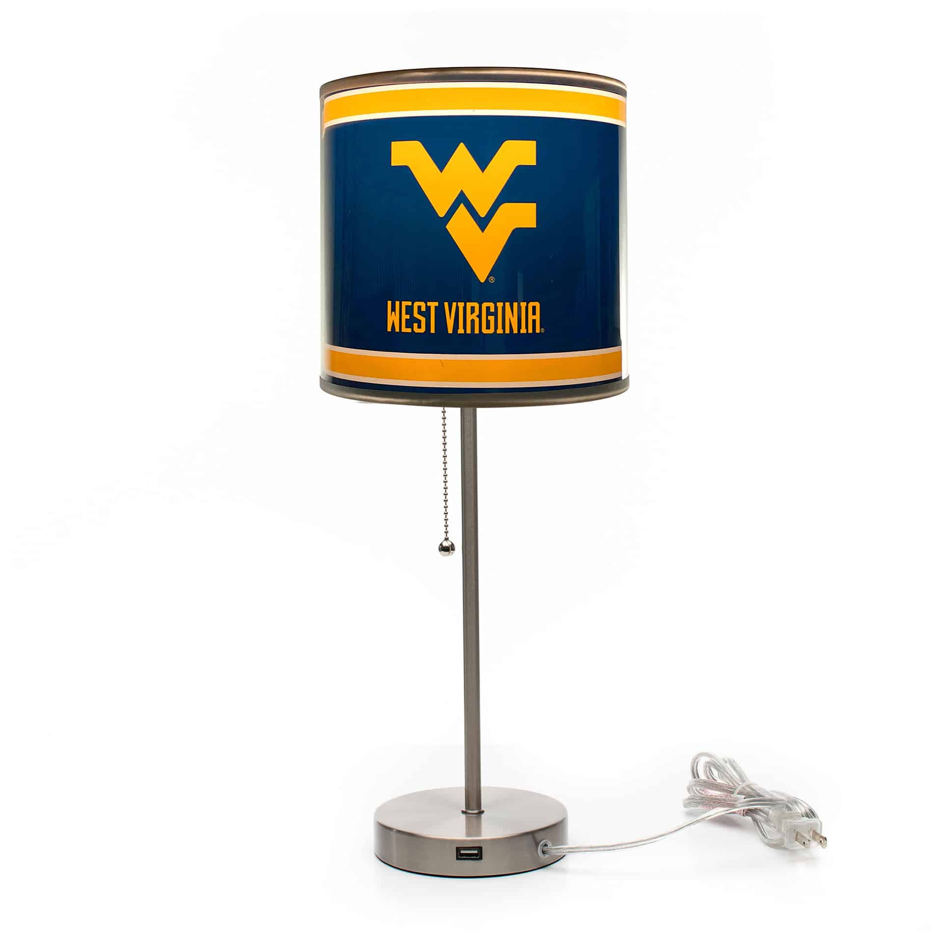 Show your team spirit with this West Virginia University Chrome USB Charging Lamp. This lamp looks great in your man cave, home office, or living room. The sleek chrome design fits any decor. It includes a clear vinyl shade with a team-themed insert. Want a new look? Just swap out the insert with a new design! The USB charging station keeps your devices ready. It is licensed by the NCAA. The dimensions (LxWxH) are 8 x 8 x 19 inches. It has a product weight of 3 lbs. It is made of metal and plastic.