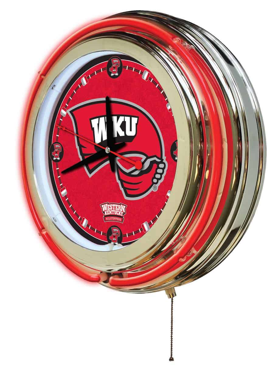 The Western Kentucky University 15-Inch Neon Logo Clock in Chrome is the ultimate addition to your man cave, showcasing your school pride in a vibrant and stylish way. This clock features a durable chrome casing and a stunning neon outer ring that complements the custom printed clock face, illuminated by a bright white inner neon ring. With its easy-to-use pull chain for turning the neon lights on and off, this clock combines functionality with flair. The accurate quartz movement ensures you’re always on time, powered by a single AA battery (not included). Perfect as a gift for graduates or sports fans, this clock is sure to impress.