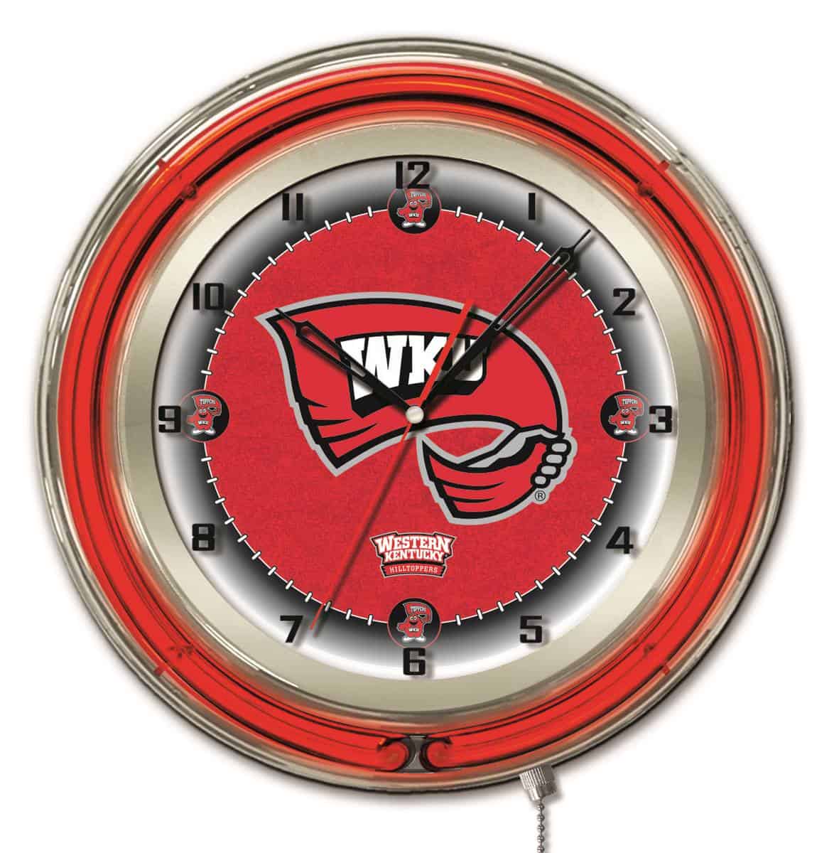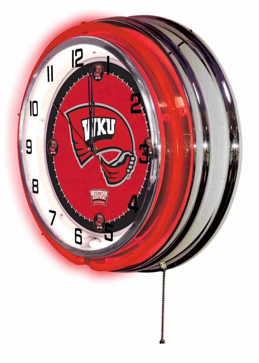 The Western Kentucky University 19-Inch Neon Logo Clock in Chrome is a vibrant and stylish addition to any fan’s collection. With its striking chrome casing and custom printed clock face illuminated by two neon rings, this clock not only tells time but also showcases your school pride. The neon rings can easily be turned on and off using a convenient pull chain, while the clock’s accurate quartz movement ensures precise timekeeping. Perfect as a gift for graduates, sports enthusiasts, or a personal treat, this clock adds a unique flair to any man cave or room.