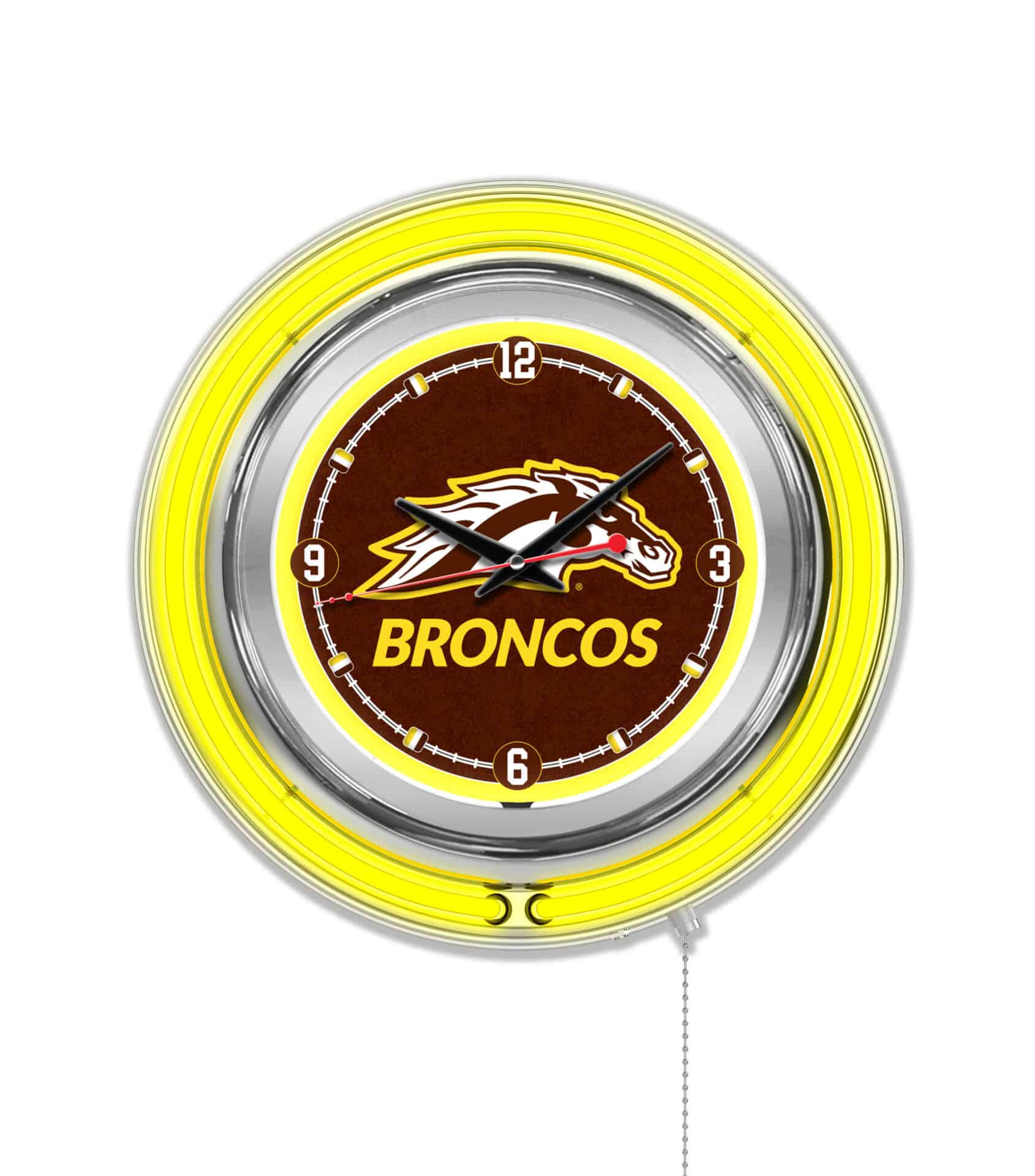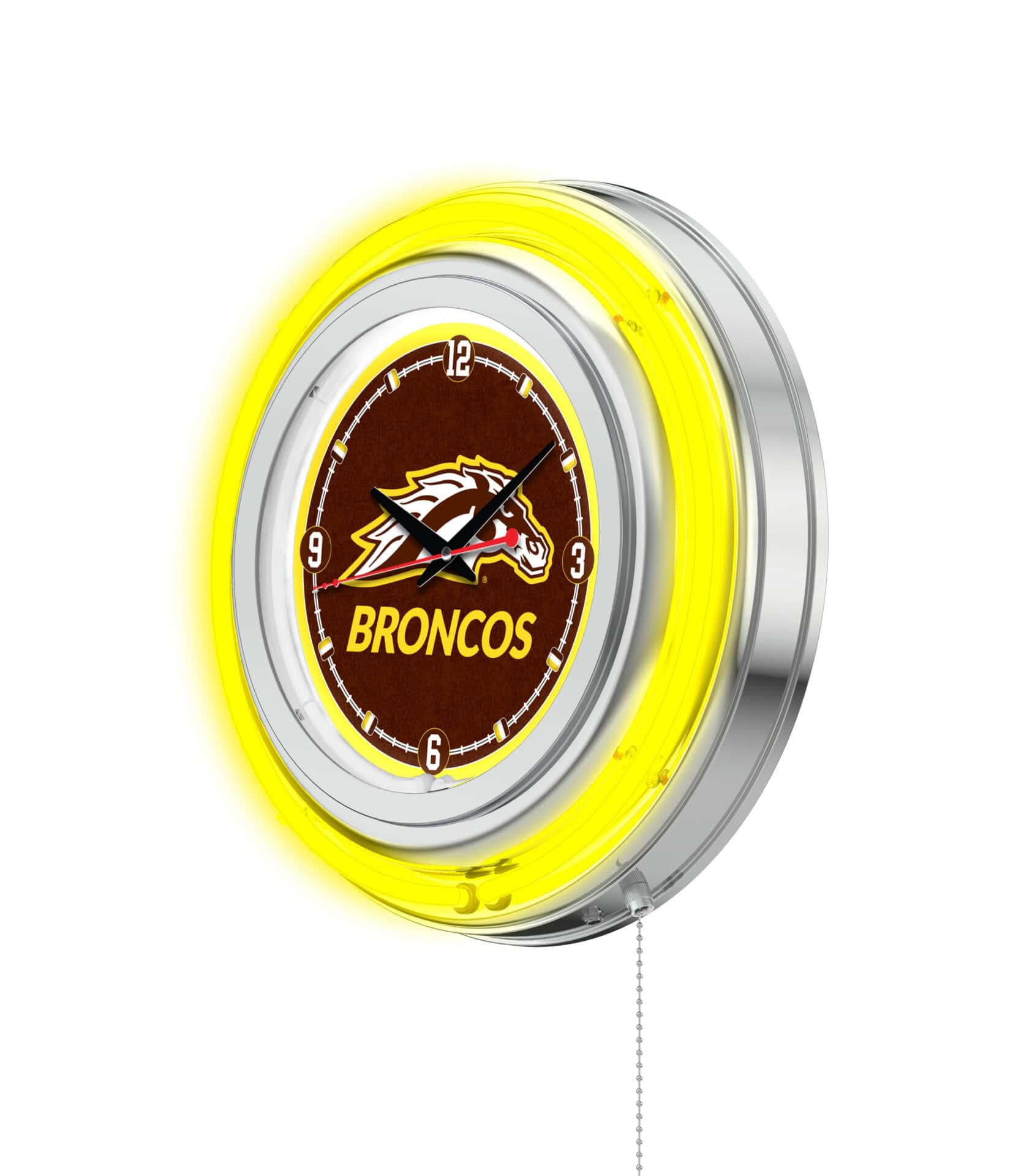 The Western Michigan University 15-Inch Neon Logo Clock in Chrome is a stunning addition to any man cave, showcasing your school pride in vibrant style. This clock features a chrome casing with a team color-specific neon outer ring, perfectly accentuating the custom printed clock face. The brilliant white inner neon ring illuminates the clock face, making it a striking centerpiece in any room. With an easy-to-use pull chain for turning the neon lights on and off, this clock combines functionality with flair. It operates on a standard 120V outlet and requires a single AA battery for timekeeping, ensuring accurate quartz movement.