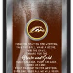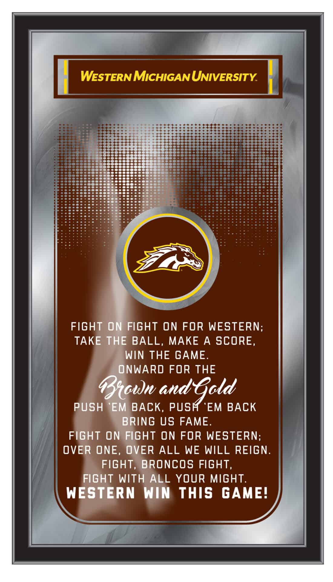 The perfect way to show your school pride, the Western Michigan University 26×15 Fight Song Wall Mirror features vibrant artwork displaying your school’s logo and the verses that energize fans on game day. With a simple yet elegant design, the colors burst through the 1/8″ thick glass, accentuated by mirrored accents. Framed in a sleek black, 1 1/4″ wrapped wood frame with saw tooth hangers, this mirror is ideal for your office, garage, or any room in your home. Whether as a gift for a recent graduate, a sports super fan, or for personal use, this mirror is a stylish addition to your decor.
