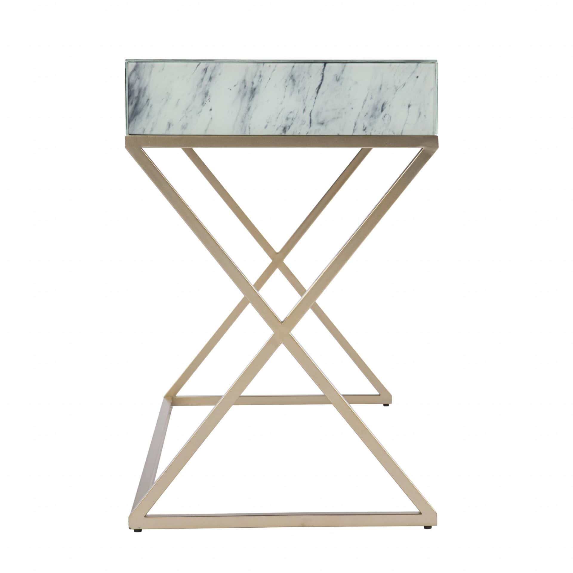 Bring a touch of classic elegance to your workspace with the 45-inch White and Bronze Glass Writing Desk With Two Drawers. This desk is designed to fit seamlessly into a variety of spaces, including living rooms, home offices, and bedrooms. Featuring a sleek rectangular shape, a sturdy sled base, and a spacious glass tabletop, it is both practical and stylish. The desk also includes two hidden drawers to keep your office essentials organized and out of sight. Built to last, this piece combines comfort, efficiency, and timeless design for years of productive use.