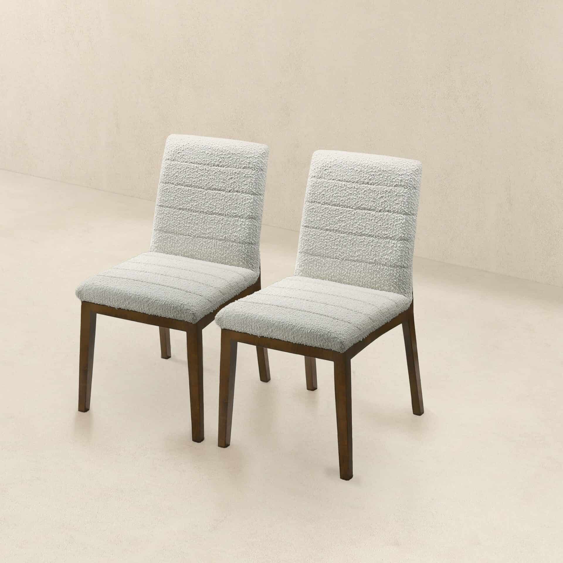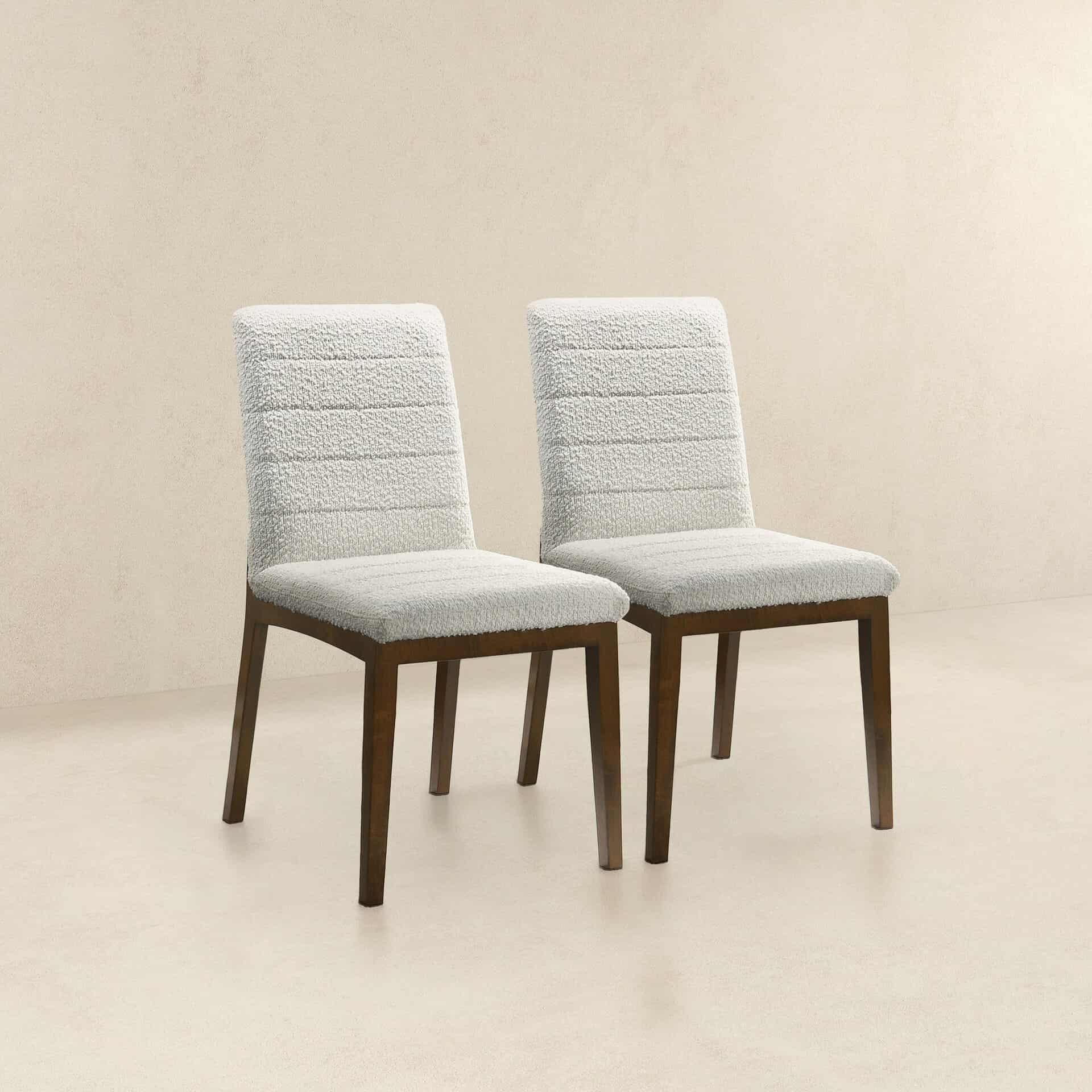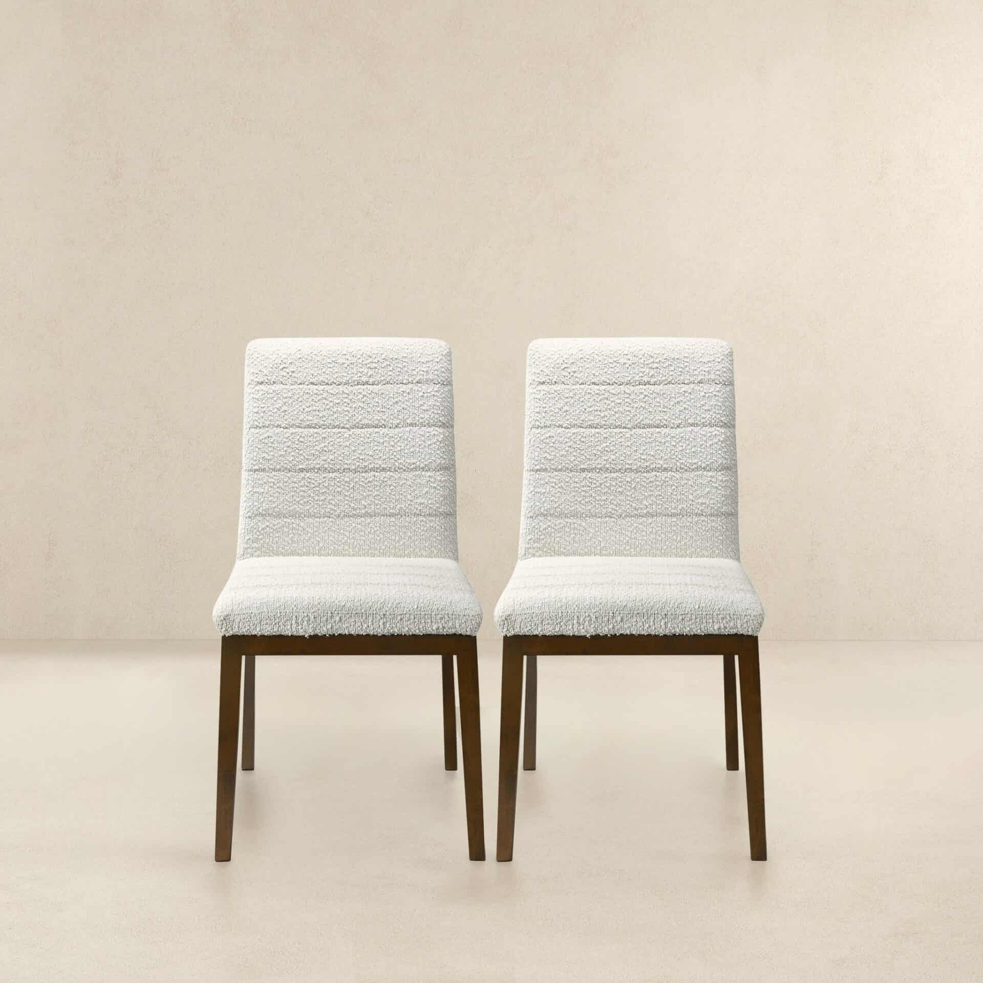 Introducing the White Boucle Upholstered Dining Chairs Mid Century Modern (Set of 2) – a perfect combination of elegance, comfort, and practicality for any space. With a solid wood walnut-colored base and soft textured white boucle fabric, these chairs bring a sophisticated, mid-century modern aesthetic to your dining area or any other living space. Designed for versatility, they are not only ideal for dining but also make a stylish addition to studies, lounges, or other areas where both comfort and design are key.