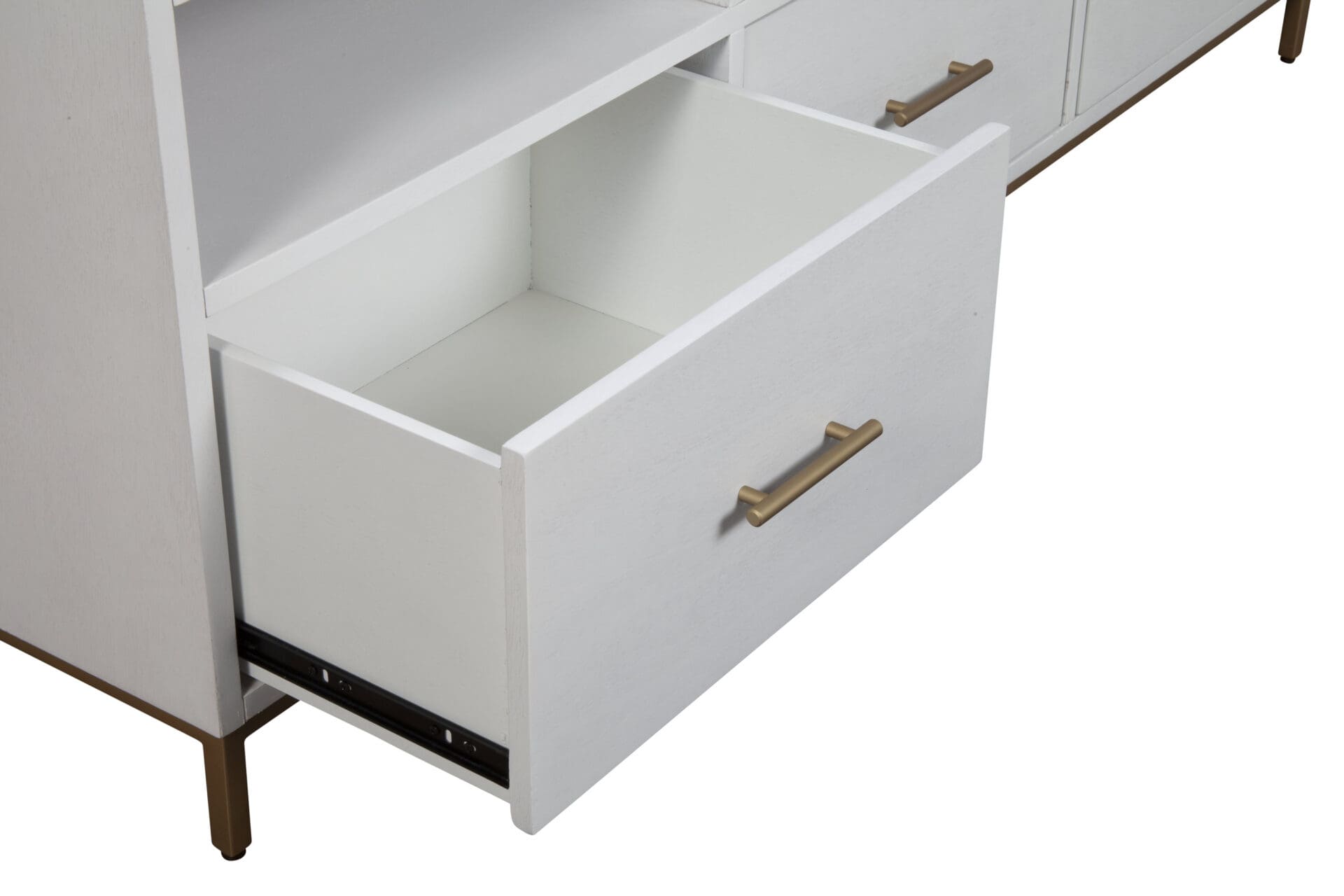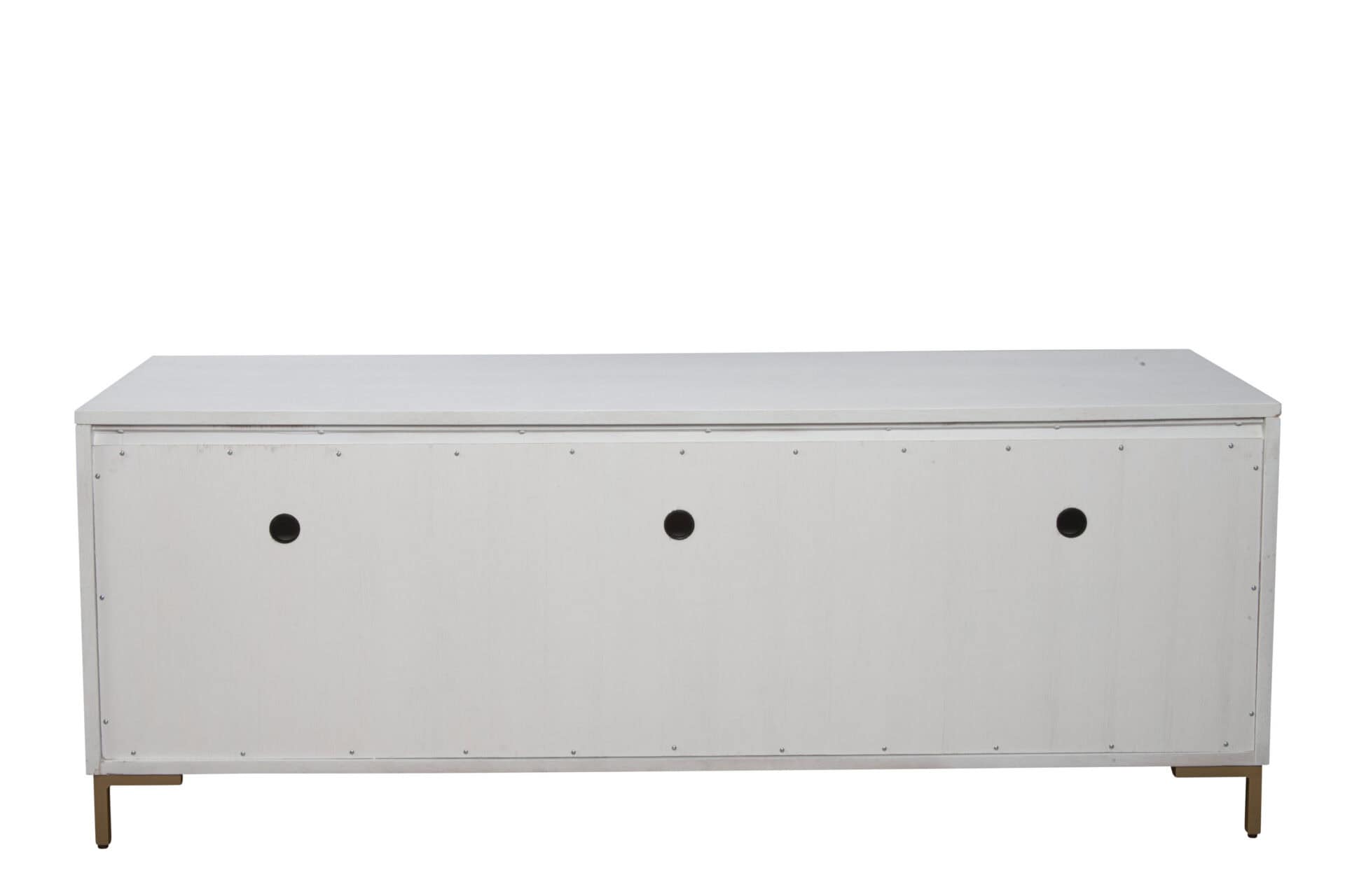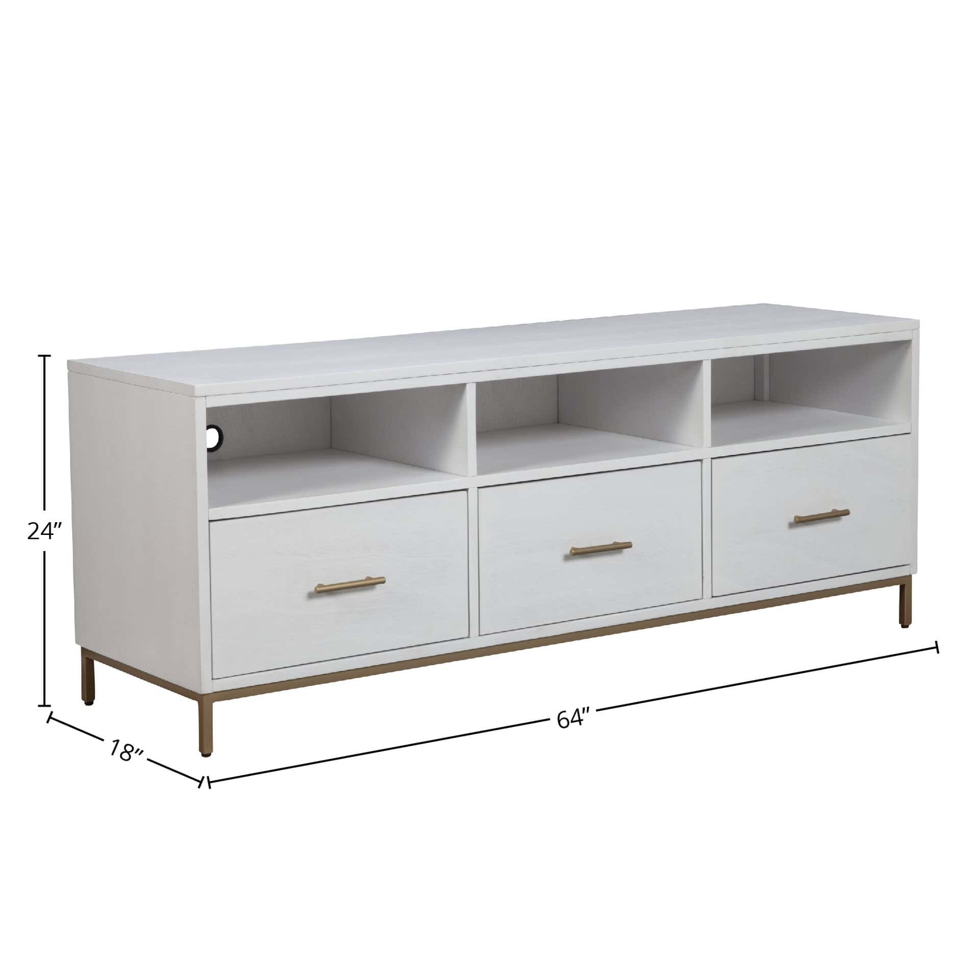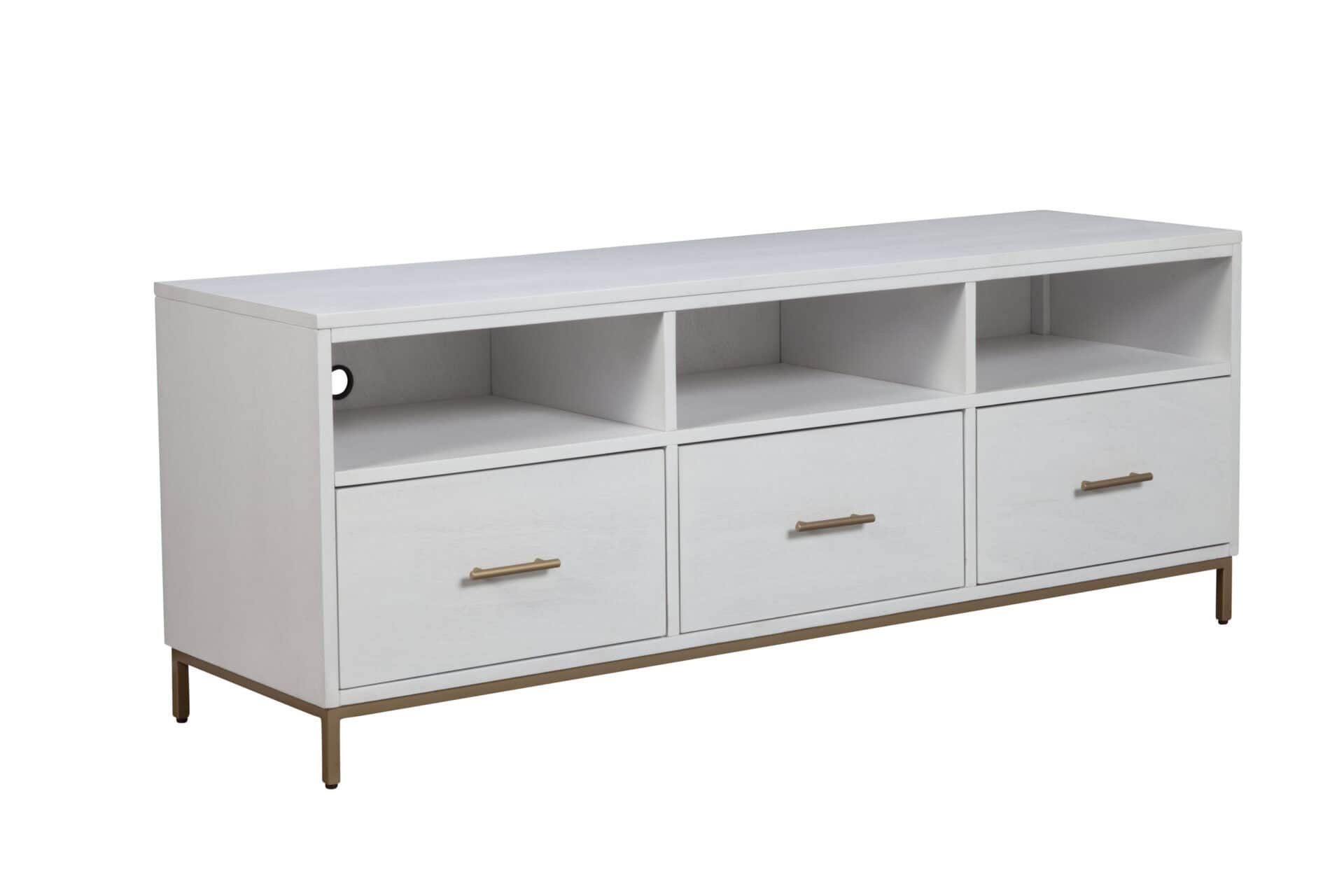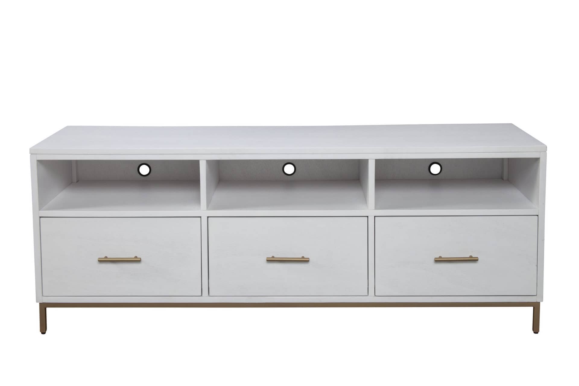 Whether it’s movie night or time for the big game, your TV becomes the focal point of your home. The White Mahogany Modern TV Console with Drawers and Shelves is crafted from beautiful mahogany and features a clean-lined rectangular silhouette with modern design appeal. This functional piece includes three storage drawers, open shelving, and built-in wire management to keep your entertainment area organized. It accommodates TVs up to 70 inches, making it ideal for any living space.