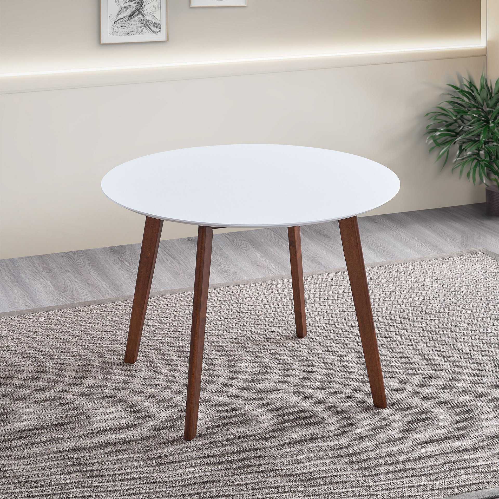 Elevate your dining experience with the White Solid Wood Round Dining Table with Mid Century Design. This table combines timeless style with exceptional durability, making it a perfect addition to your man cave dining room. Featuring a sleek white tabletop crafted from high-quality MDF and supported by solid wood legs in a warm walnut finish, this table exudes sophistication while ensuring long-lasting stability. The compact round design is ideal for intimate gatherings, offering versatility and charm for any space.