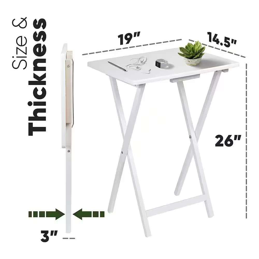Each table boasts a spacious, flat rectangular tabletop with smooth edges, providing a stable surface for various activities. Whether you’re enjoying a cozy meal in front of the TV, completing work tasks, or hosting a game night, these versatile tray tables are up to the task. Their sturdy construction ensures long-lasting use, while the space-saving design allows for compact storage when not in use.