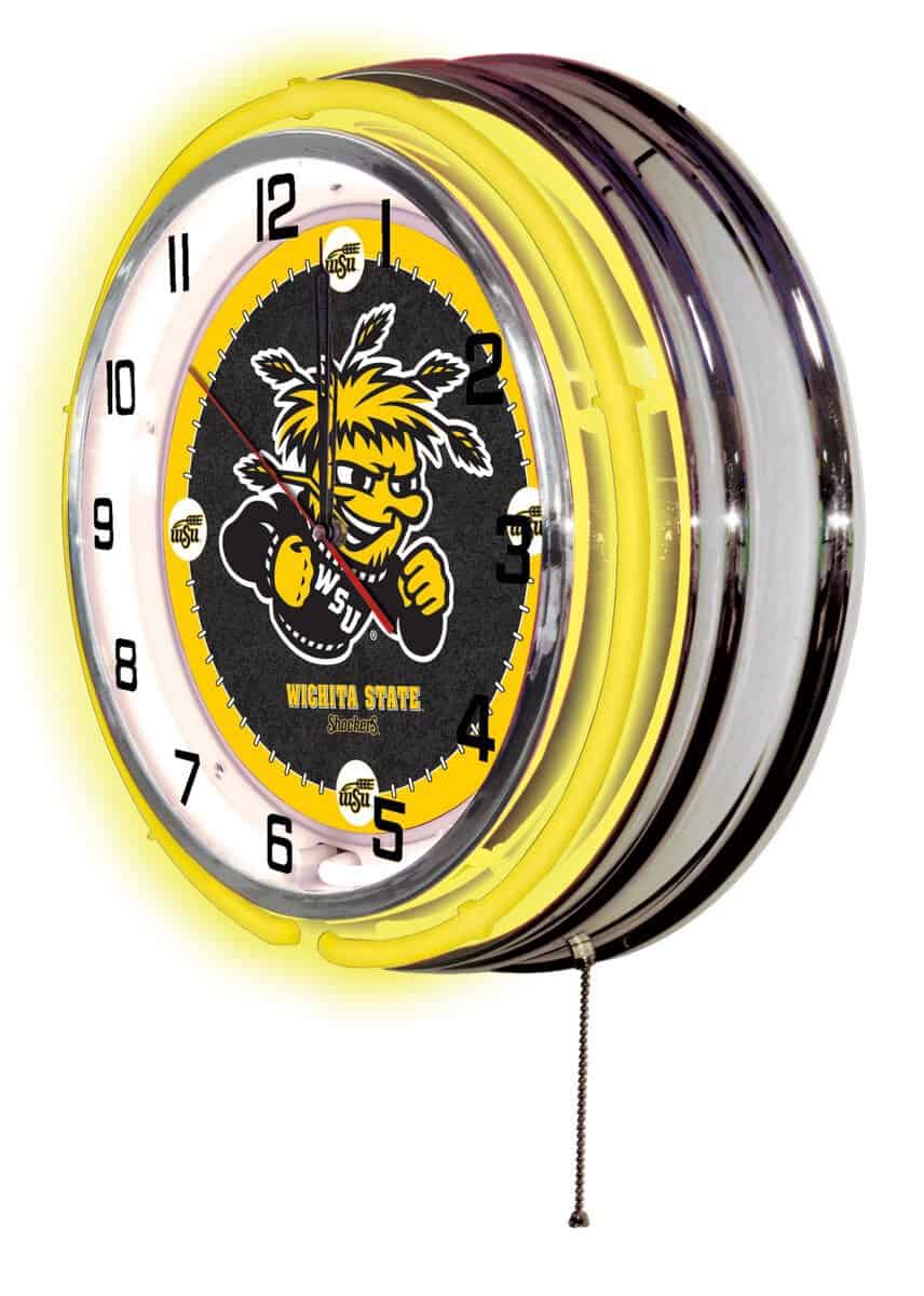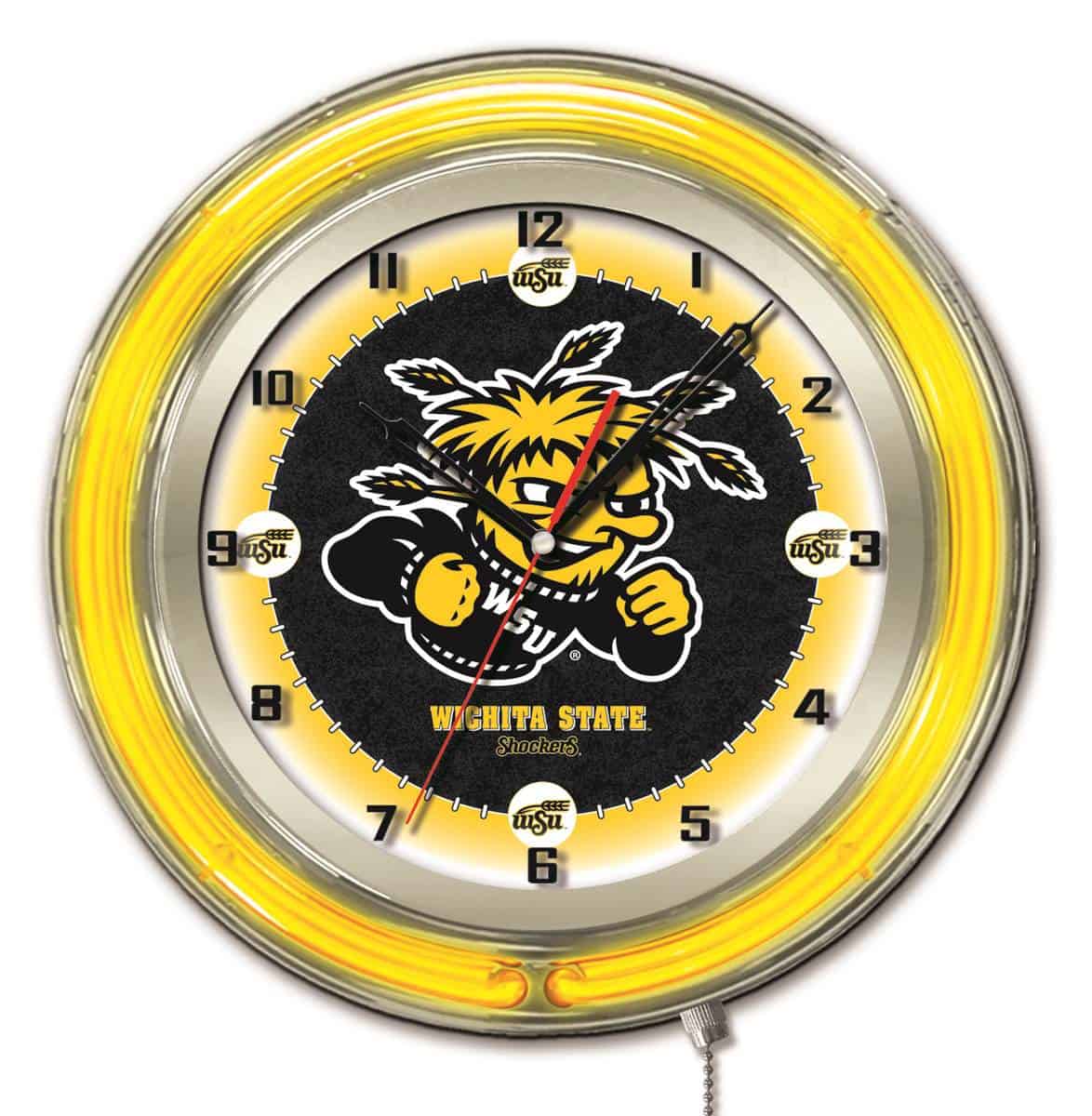The Wichita State University 19-Inch Neon Logo Clock in Chrome is an eye-catching addition to any space, showcasing vibrant team pride. This clock features a sleek chrome casing and a neon outer ring in team colors, illuminating a custom printed clock face with a brilliant white inner neon ring. The easy-to-use pull chain allows for effortless on/off operation, while the accurate quartz movement ensures you always know the time. Perfect as a gift or for personal use, this clock combines style and functionality.