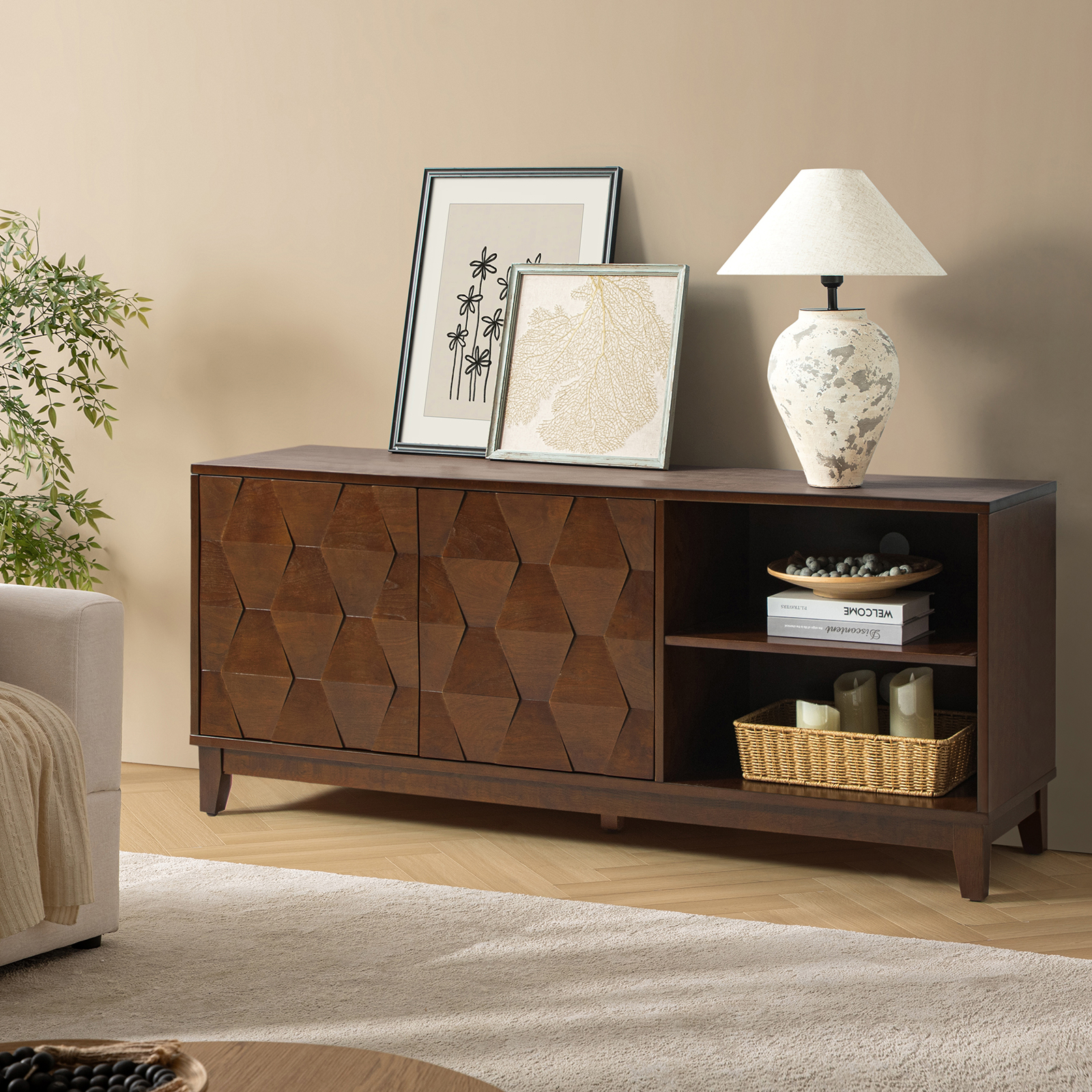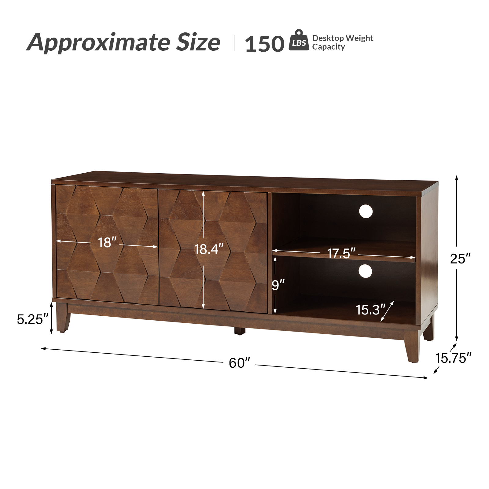 This 60-inch TV stand combines modern aesthetics with practical functionality, making it a stylish and efficient addition to any living room or entertainment area. The geometric patterned cabinet doors add a touch of contemporary flair, while the push-to-open mechanism provides easy access to your media components. Adjustable shelves and cable management holes ensure a tidy and organized entertainment setup.