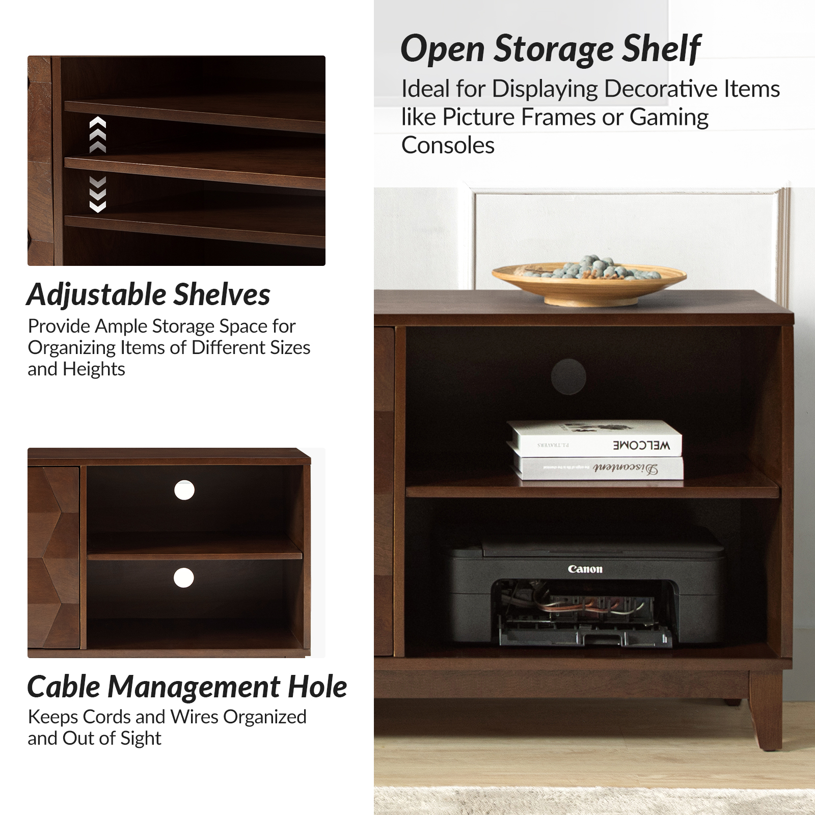 The geometric patterned cabinet doors add a unique visual element, enhancing the stand’s overall aesthetic appeal. The push-to-open doors offer a sleek, handle-free design, allowing for effortless access to storage compartments. Inside, adjustable shelves provide flexible storage options for various media equipment and accessories. An open storage shelf on the right side is perfect for displaying decorative items or storing frequently used devices. Finally, cable management holes keep cords organized and out of sight, maintaining a clean and clutter-free environment.