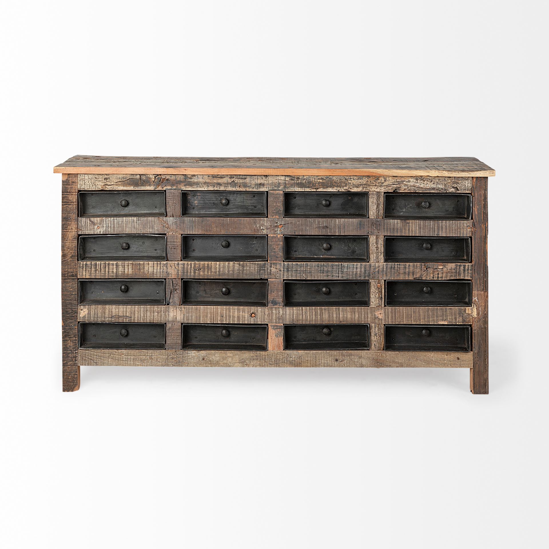 Featuring drawer fronts repurposed from old bread loaf pans, each piece tells a unique story. The blend of roughened wood and blackened metal creates a worn and cozy aesthetic. With sixteen drawers, this sideboard is perfect for stashing away your dining room essentials and keeping your space clutter-free.