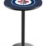 Transform your bar, game room, or man cave with this high-quality 42-inch pub table. Featuring a sleek black wrinkle finish and a durable 36-inch round top, this table is built to impress and endure. The vibrant, full-color laminate top is scratch-resistant and easy to clean, ensuring it remains in pristine condition for years to come. Its commercial-grade construction promises superior stability, while the adjustable feet accommodate uneven flooring. Perfect for any sports enthusiast, this table adds a touch of class and functionality to your space.