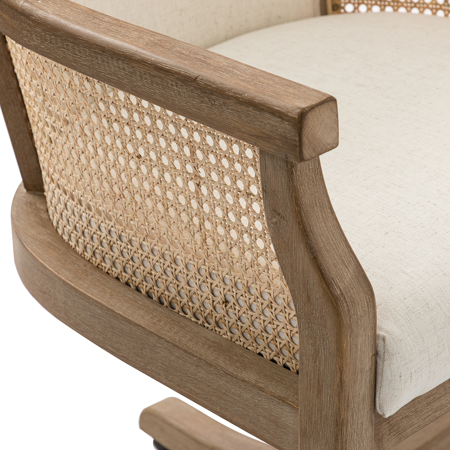 This task chair brings an eye-catching spare seat to your office! The shapely frame is crafted of substantial hardwood with an airy caned barrel back for wrap-around support. Enjoy the farmhouse pastoral style, greater sitting width, and a swivel base with wheels for easy movement and conversations. The backrest helps maintain the natural curve of the spine, and the curved seat fits the curve of the human body. Most importantly, you can adjust accurate height alterations fast to meet dynamic requirements.