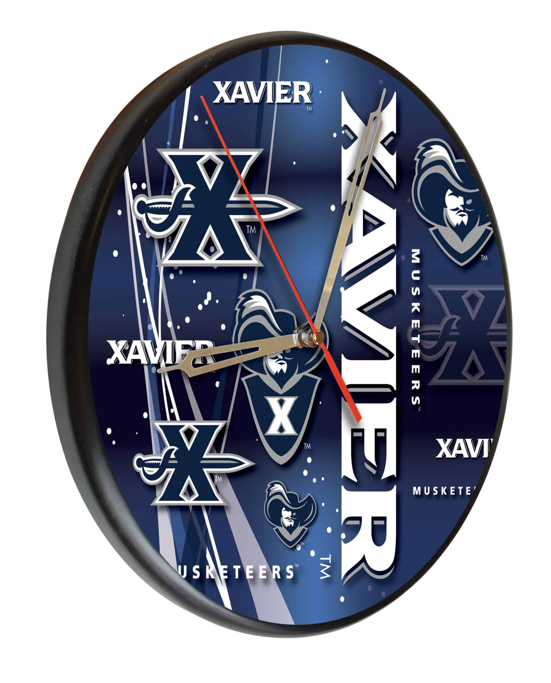 The “Xavier 13-Inch Solid Wood Clock in Black is an ideal addition to your man cave, showcasing your school pride with style and functionality. Featuring first surface, digitally printed graphics that use UV inks for long-lasting durability, this clock combines aesthetics with practicality. It is powered by an accurate quartz movement and requires only a single AA battery (not included). The recessed keyhole hanger allows for easy installation and ensures a flat, clean appearance on your wall. Perfect as a gift for graduates or sports enthusiasts, this clock represents quality craftsmanship.