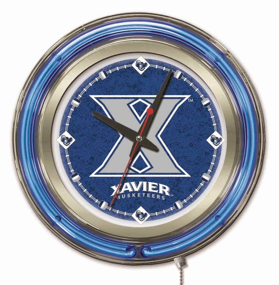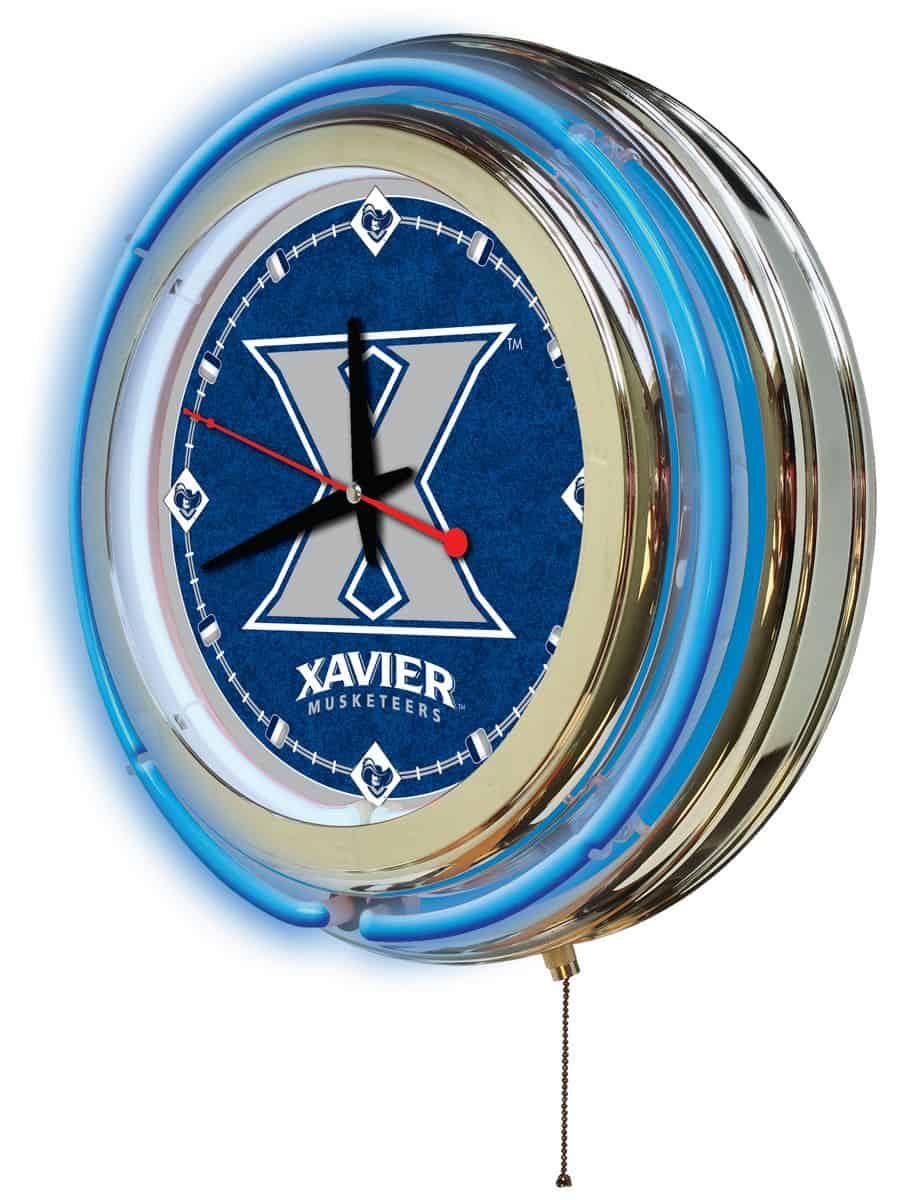 The “Xavier 15-Inch Neon Logo Clock in Chrome is a stunning addition to any man cave, showcasing vibrant artwork and a unique neon design that highlights your school pride. This clock features a durable chrome casing and a neon outer ring in team colors, illuminating the custom printed clock face with a brilliant white inner neon ring. The pull chain allows for easy on/off operation, making it convenient to use. Powered by a UL Listed transformer and a single AA battery (not included), this clock offers accurate quartz movement, ensuring you always keep track of time.