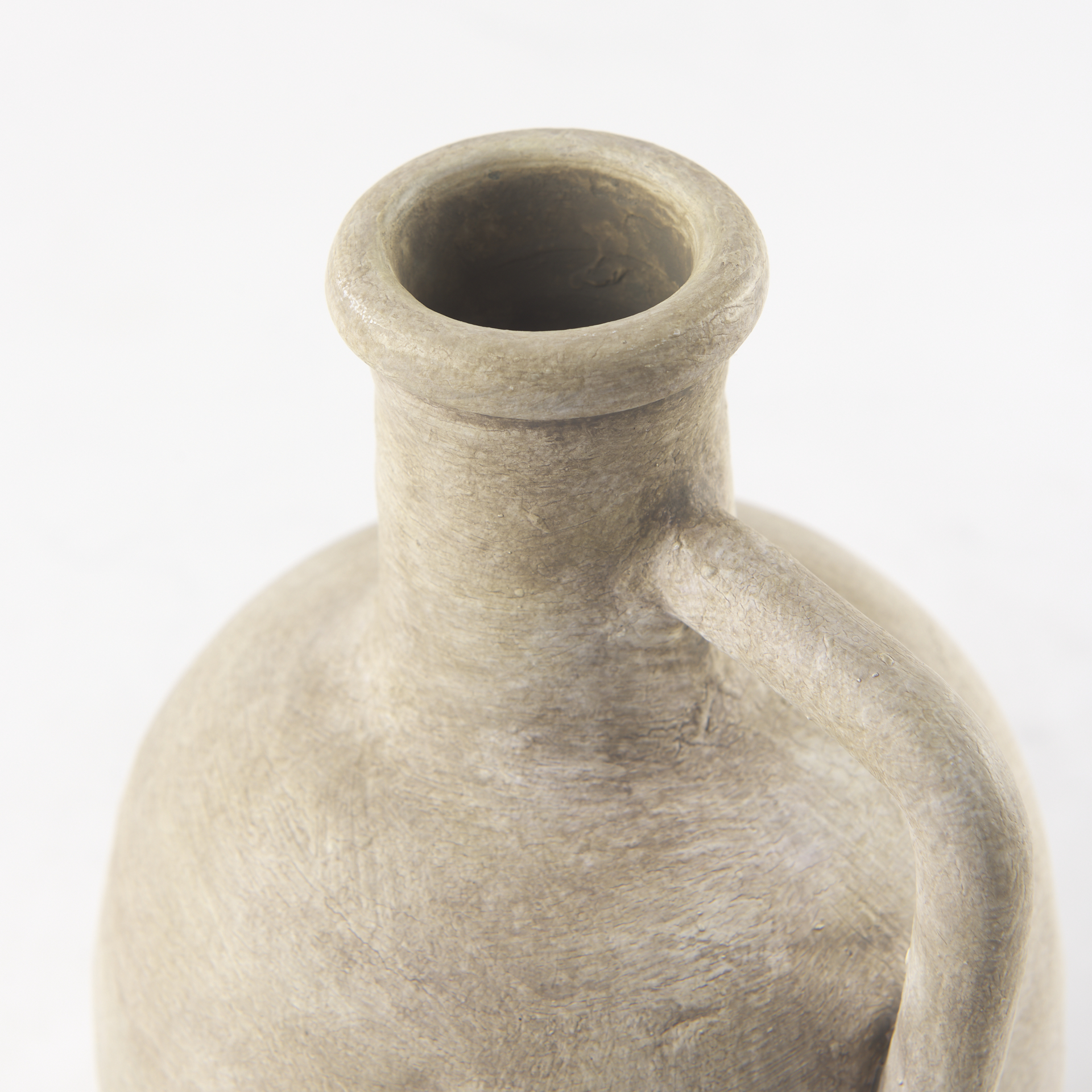 This versatile vase can fit into a rustic-inspired or modern interior with its narrow neck, delicate handles, and beautifully surfaced exterior. It’s perfect as a standalone statement piece or grouped with others.