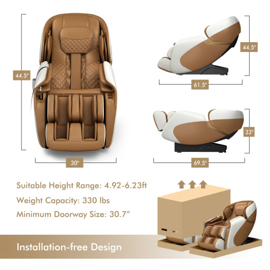 With 28 strategically placed airbags, far-infrared back heat therapy, and foot rollers, this chair provides a comprehensive massage to relieve fatigue and promote circulation. The yoga stretching function and retractable calf frame further enhance comfort, while the wireless music player and intelligent voice control improve usability. Its installation-free design ensures a hassle-free setup.