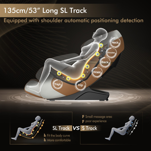 - SL Track and Yoga Stretching: The 53-inch SL track conforms to body curves, providing a full massage from neck to thighs. Yoga stretching relaxes the entire body, while the retractable calf frame suits users of various heights.